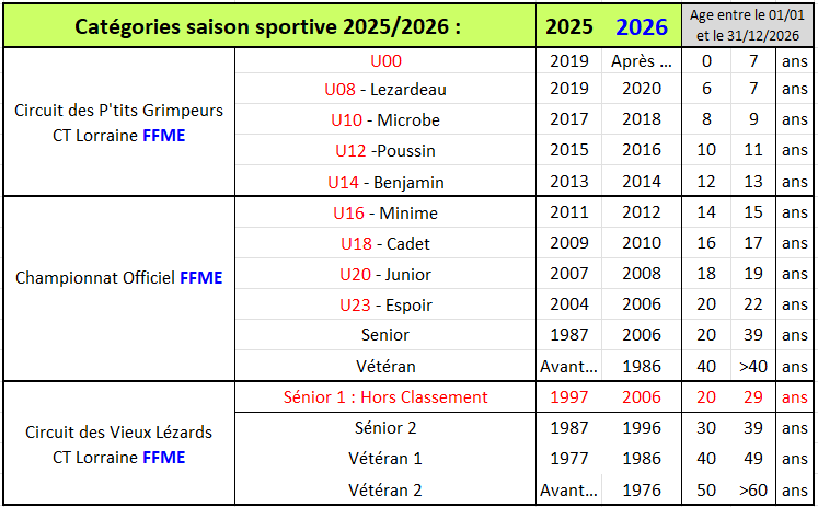 La catégorie est fonction de l’âge qu’aura le licencié entre le 1er janvier et le 31 décembre 2026. Pour connaître sa catégorie, il faut donc se référer à son année de naissance.