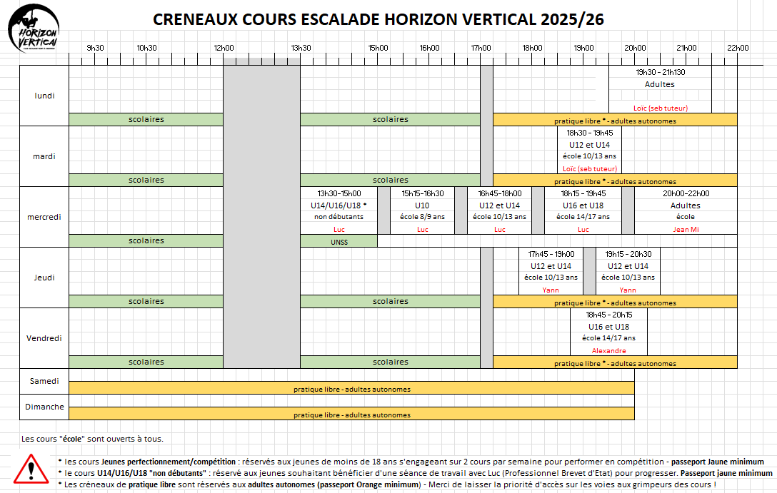 * ATTENTION, lors de la pratique « adultes autonomes » sous couvert d’un référant de séance, et sur les créneaux de cours, la priorité des voies est donnée aux grimpeurs encadrés.